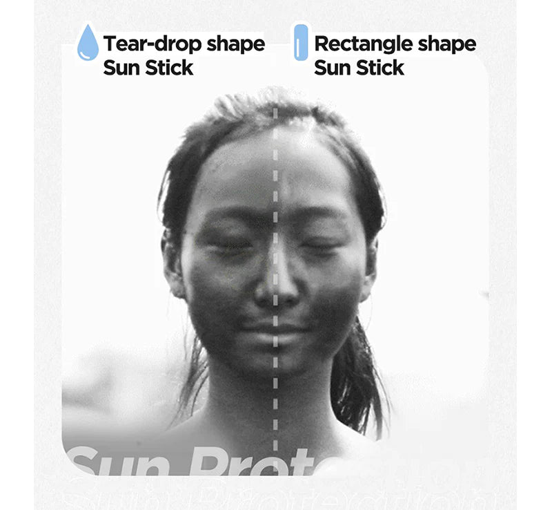 Its unique tear-drop shape allows for precise application even on curved areas of the face like around the eyes and nose. The sun stick applies transparently without leaving a white cast and has a smooth, matte finish, making it suitable for all skin tones and can be used over makeup.