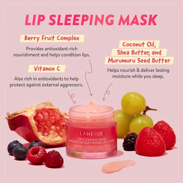 Introducing the LANEIGE Lip Sleeping Mask - the overnight miracle for your lips! This iconic, fan-fave pout perfector is a special intensive-care mask for lips. With nourishing Berry Fruit Complex™, Murumuru seed and Shea butter, this hydrating lip mask delivers intense moisture and antioxidants while you sleep for visibly smoother, baby-soft lips in the AM. Say goodbye to dry, chapped lips and wake up to a soft, supple pout that's ready to take on the day.