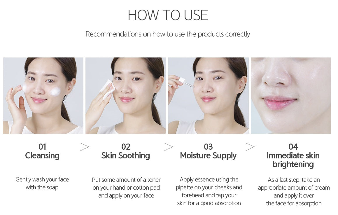 3. Essence: Take a small amount of essence and gently massage it onto your face and neck. 4. Allow it to absorb completely before proceeding to the next step.